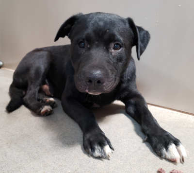 “Solito” is a male pit bull terrier with a black and white coat.