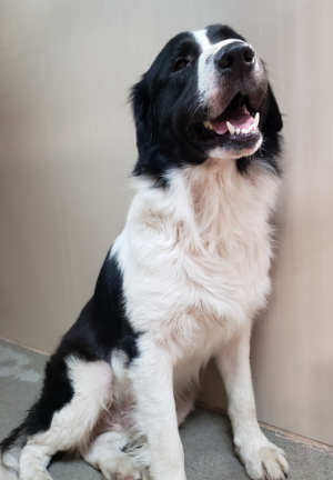 “Oso Panda” is a male border collie with a long black and white coat.