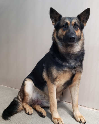 “Luna” is a female German Shepherd with a medium-length black and tan coat.