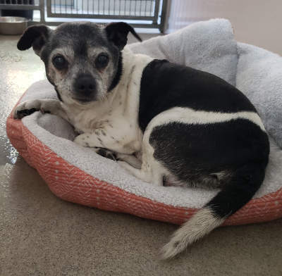 “Tico” is a senior male Chihuahua-pug mix with a short black and white coat.