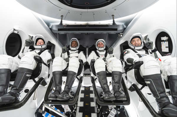 NASA’s SpaceX Crew-1 crew members are seen seated in the company’s Crew Dragon spacecraft during crew equipment interface training. From left to right are NASA astronauts Shannon Walker, mission specialist; Victor Glover, pilot; and Mike Hopkins, Crew Dragon commander; and JAXA astronaut Soichi Noguchi, mission specialist. Photo credit: SpaceX. NASA and SpaceX are targeting no earlier than Oct. 23 for the first operational flight with astronauts of the Crew Dragon spacecraft and Falcon 9 rocket to the International Space Station as a part of the agency’s Commercial Crew Program.