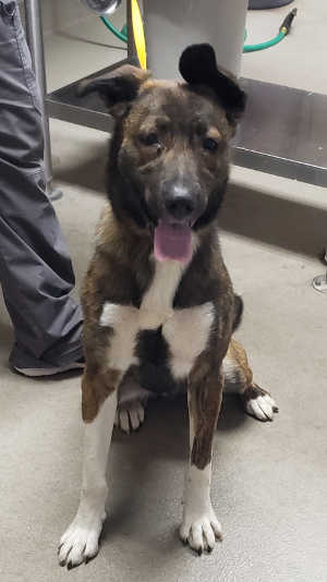 This female shepherd mix has a brindle and white coat.
