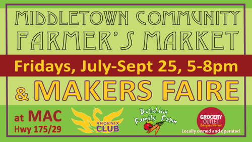 The Middletown Community Farmer’s Market and Makers Faire is a collaborative effort of the Phoenix Club, DeJulius Family Farm and MAC, sponsored in part by Clearlake Grocery Outlet.