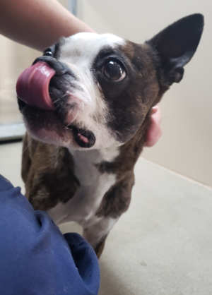 “Oso” is a male Boston Terrier with a short black and white coat.