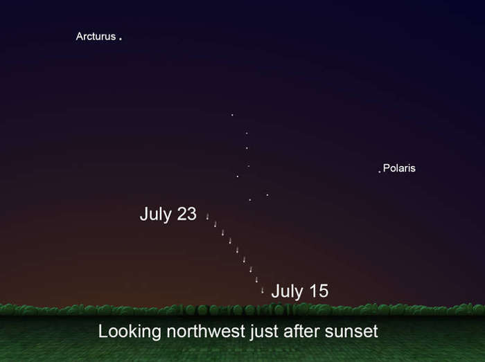 Each night, the comet will continue rising increasingly higher above the northwestern horizon as illustrated in the below graphic.