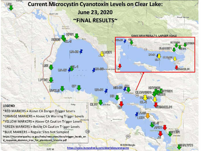 LAKE COUNTY, Calif. – Updated results from water quality testing at numerous locations on Clear Lake have confirmed several sites are at the “danger” level for cyanotoxins.