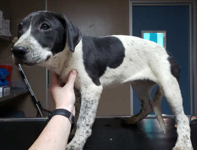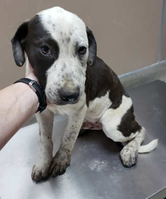 This young female Catahoula Leopard Dog has a short white coat with black spots.