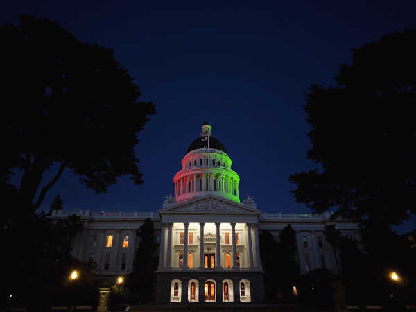 The California Capitol Dome was lit up in red, black and green, the pan-African colors that represent the African diaspora to enslavement in the New World, on Friday, June 19, 2020. Governor Gavin Newsom has declared Saturday, June 20, 2020, as Juneteenth in the state. Photo courtesy of the California Governor’s Office. Gov. Gavin Newsom issued a proclamation Friday commemorating June 20 as Juneteenth in California.