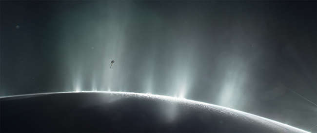 This illustration shows NASA's Cassini spacecraft flying through plumes on Enceladus in October 2015. Credits: NASA/JPL-Caltech. Several years ago, planetary scientist Lynnae Quick began to wonder whether any of the more than 4,000 known exoplanets, or planets beyond our solar system, might resemble some of the watery moons around Jupiter and Saturn.