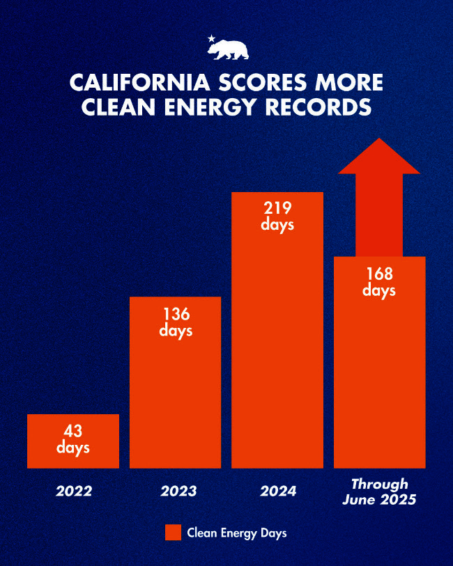 “The fourth largest economy in the world is running on more clean energy than ever before. Clean energy met our grid’s total demand for some part of the day almost every day this year — the equivalent of 51 full days powered by 100% clean electricity,” said Gov. Gavin Newsom. “Trump and Republicans can try all they want to take us back to the days of dirty coal but the future is cheap, abundant clean energy.”