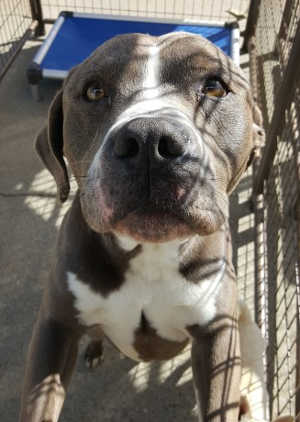 “Tyson” is a male American Staffordshire Terrier with a short gray and white coat.