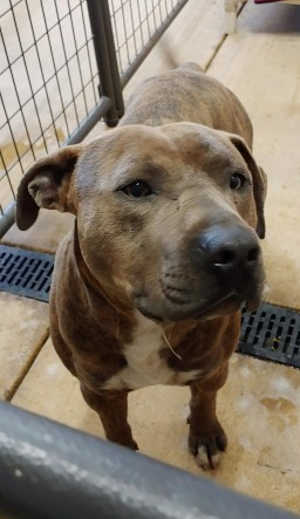 “Spud” is a male American Staffordshire Terrier with a short brindle and white coat.