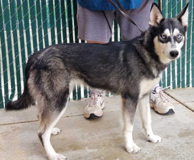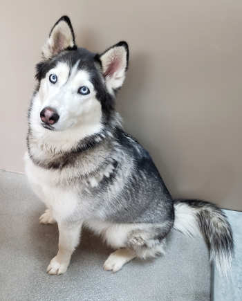 “Luna” is a young female husky with a medium-length gray and white coat.