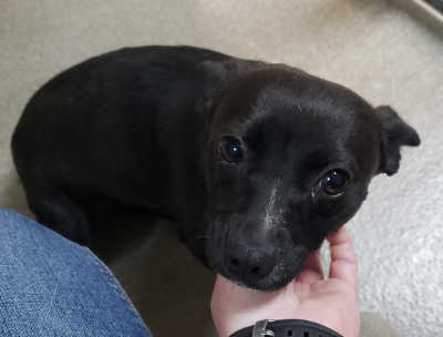 This female Chihuahua has a short black coat with white markings.