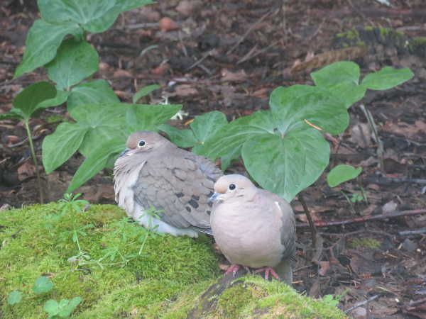 Since mourning doves are seed eaters, a pair is often seen near my backyard bird feeder after the blue jays, nuthatches, grosbeaks and house finches spill some tasty tidbits for their meal.