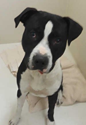 “Woodrow” is a male Staffordshire Bull Terrier with a black and white coat.