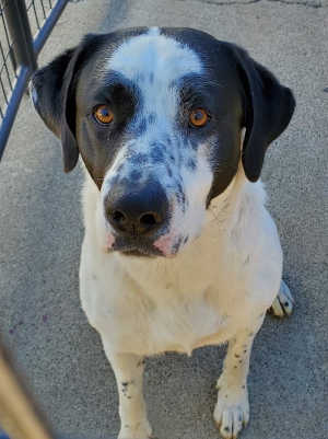 “Buddy” is a male spaniel mix with a black and white coat.