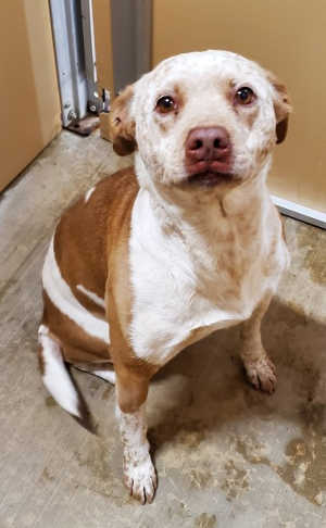 “Freckles” is a female Australian Cattle Dog mix with a short red and white coat.