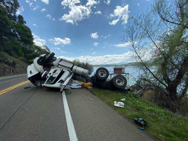 Reports from the scene said the truck overturned onto its roof and blocked the westbound lane, with debris in the eastbound lane and a tanker detached and in the lake.