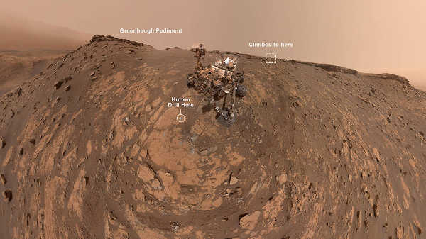 In front of the rover is a hole it drilled while sampling a bedrock target called "Hutton." The entire selfie is a 360-degree panorama stitched together from 86 images relayed to Earth. The selfie captures the rover about 11 feet (3.4 meters) below the point where it climbed onto the crumbling pediment.