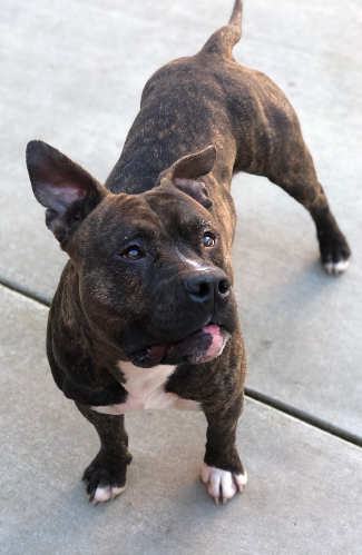 “Ava” is a female American Staffordshire Terrier with a short black and tan coat.