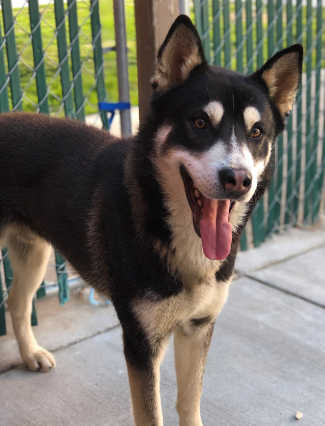 “Tyson” is a male German Shepherd with a medium-length tan and black coat and brown eyes.