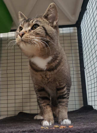 This male domestic short hair cat has a brown tabby and white coat and gold eyes.