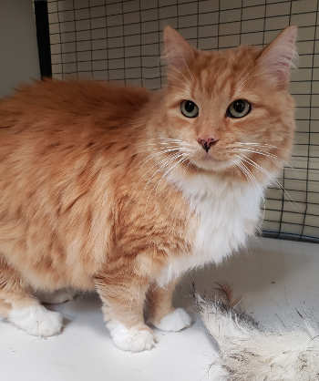 “Shelby” is a male orange tabby with a long coat and green eyes.