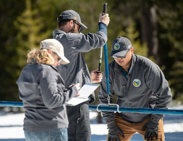 Sean de Guzman (Right), chief of California Department of Water Resources, Snow Surveys and Water Supply Forecasting Section, conducts the third media snow survey of the 2020 season at Phillips Station in the Sierra Nevada Mountains. Nate Burely (center), with DWR’s Water Resources Engineer, Reservoir Coordinated Operations Section, and Molly White (Left), DWR’s Chief of State Water Project Water Operations Office, assist with the survey, which was held approximately 90 miles east of Sacramento off Highway 50 in El Dorado County. Photo taken on Thursday, February 27, 2020. Ken James/California Department of Water Resources. NORTHERN CALIFORNIA – The Department of Water Resources on Thursday conducted the third manual snow survey of 2020 at Phillips Station.