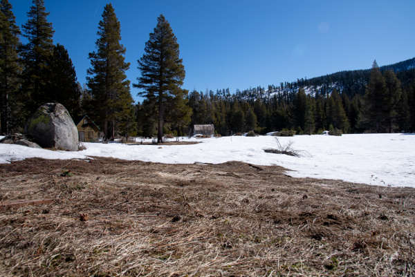 A patch of bare ground was visible at Phillips Station in the Sierra Nevada Mountains, the site of the California Department of Water Resources third snow survey of the 2020 season. The survey was held approximately 90 miles east of Sacramento off Highway 50 in El Dorado County. Photo taken on Thursday, February 27, 2020. Kelly M. Grow/California Department of Water Resources.