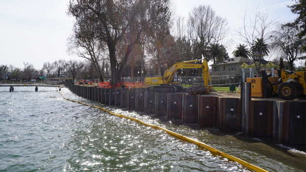 The project will remove and replace the sidewalk along the promenade that lines the lakeshore that was damaged, along with the seawall, in the 2017 and 2019 storms. West Coast Contractors is currently replacing the original damaged cinder block seawall with a sheet pile wall.