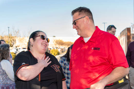 Riviera Elementary teacher and Garden Committee member Mary Beth Abordo thanks Vernon Parker, manager of the Tractor Supply Co. store in Clearlake, California, for its help with the garden at the school, located in Kelseyville, California. Courtesy photo.