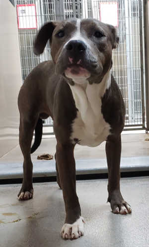 This male pit bull terrier has a short blue and white coat and brown eyes.