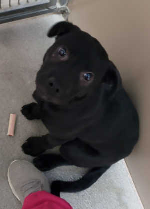 This young female pit bull-Labrador Retriever mix has a short black coat and brown eyes.