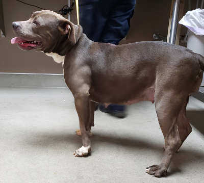 This female pit bull terrier mix has a short gray and white coat with gold eyes.
