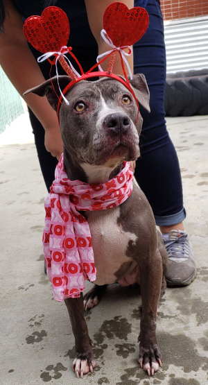 “Blossom” is a female pit bull terrier with a short blue coat and brown eyes.