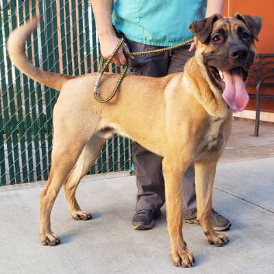 “Goofy” is a young male Rhodesian Ridgeback with a short tan and black coat.