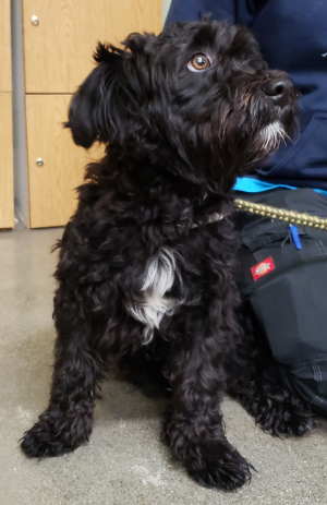 “Butter” is a female terrier with a long tricolor coat and brown eyes.