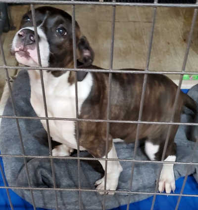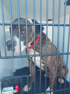 “Chris” is a male American Staffordshire Terrier mix with a short brindle and white coat.