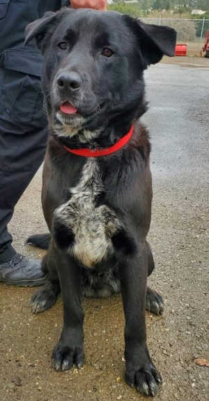 “Mack” is a male Labrador Retriever mix with a short black coat and white markings.