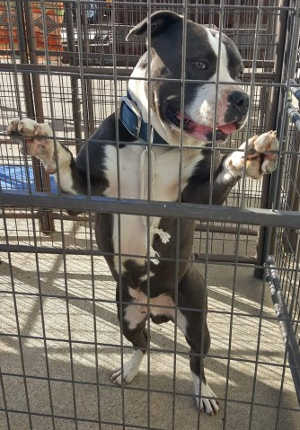 “Blue” is a female Staffordshire Bull Terrier with a short blue and white coat.