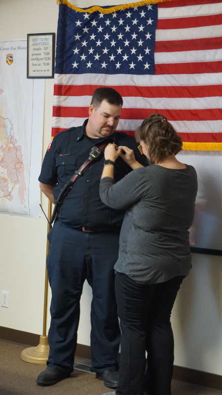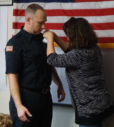 Newell’s wife Casey, herself a volunteer firefighter, pinned on his badge as Ciancio held their small daughter, Ember.