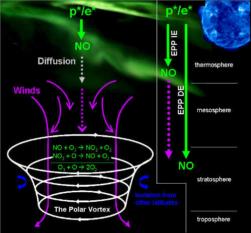 “Nitric oxide under appropriate conditions can be transported to the stratosphere where it will catalytically destroy ozone,” Bailey said. “Those changes in ozone can lead to changes in stratospheric temperature and wind and may even impact the circulation near Earth’s surface.”