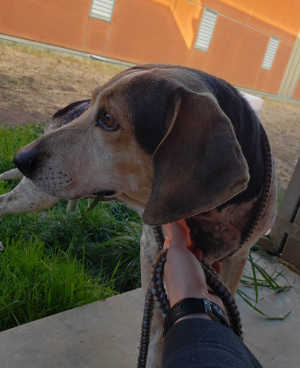 “Daisey” is a female treeing walker coonhound/bluetick coonhound mix with a short tricolor coat.