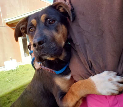 “Oso” is a male shepherd mix with a long black and tan coat.