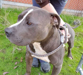 “BamBam” is a young male pit bull terrier mix with a short gray and white coat.