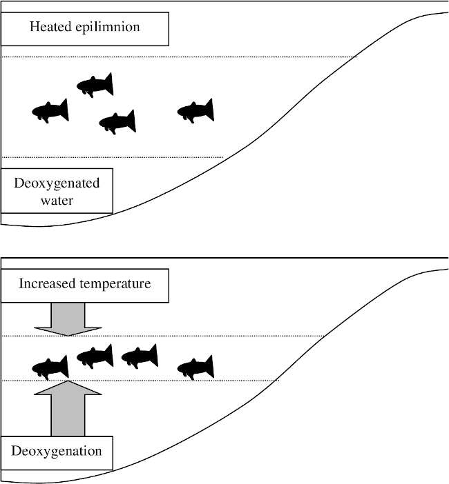 Fish can suffocate from no oxygen and can become stressed in heated water and a massive fish die-off can result. If this event happens in a bay or cove, larger, mature fish usually swim into open, deeper, cooler waters, but small and juvenile fish, who would be prey in open waters, might not swim to safety.