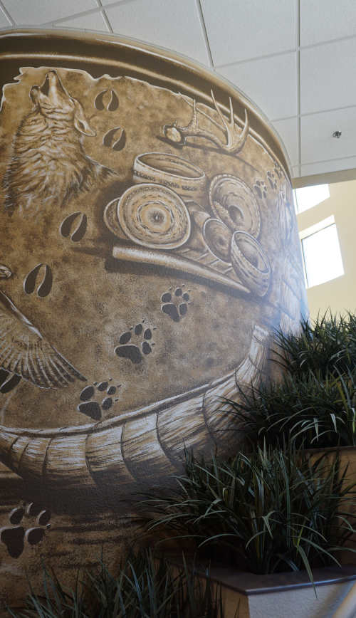 Moving up the large spiral staircase, there is a mural of Lake County wildlife and geography, along with a map of Clear Lake and the six tribes in the consortium: Big Valley Rancheria, Elem Colony, Habematolel Pomo, Middletown Rancheria, Robinson Rancheria and the Scotts Valley Pomo. A seventh Lake County tribe, the Koi Nation, is not a consortium member.
