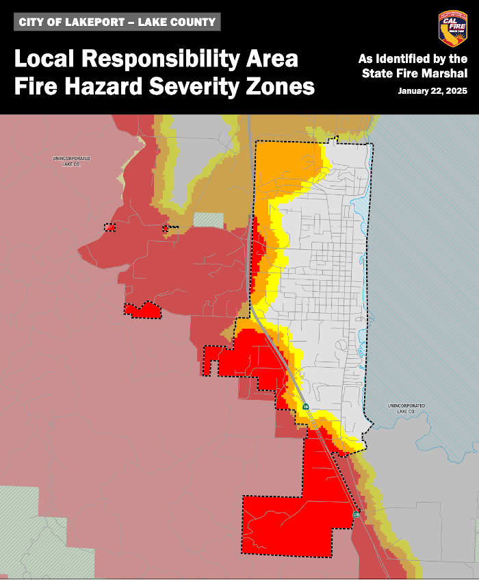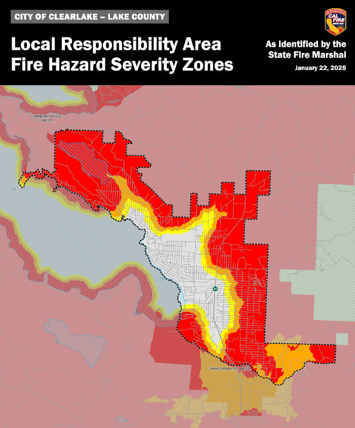 Detailed maps for the three jurisdictions in Lake County can be found here. More information can be found on Cal Fire’s webpage, under the “Local Responsibility Area Fire Hazard Severity Zone Map” tab.