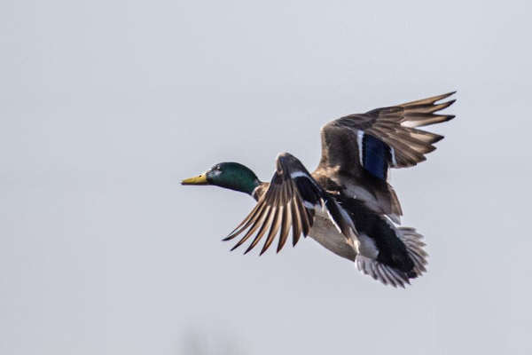 The males are easily recognized by their iridescent green head and yellow bill, while both males and females have a patch of bright blue on their wings.